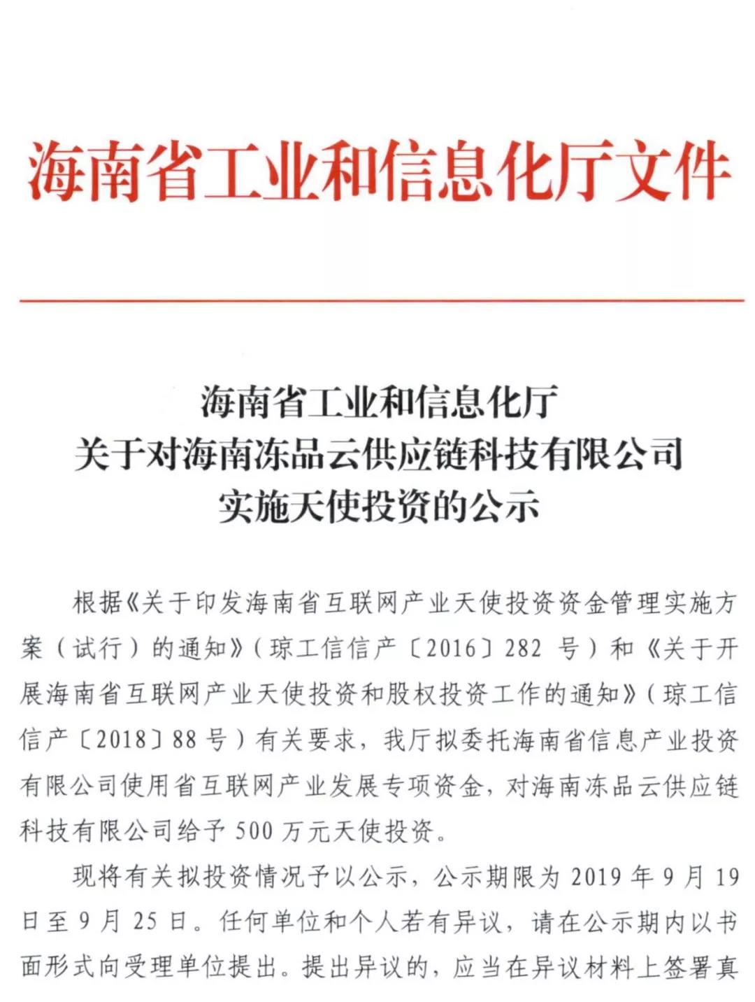 近期,海南省工業(yè)和信息化廳發(fā)布關(guān)于對海南股權(quán)交易中心掛牌企業(yè)海南凍品云供應(yīng)鏈科技有限公司實(shí)施天使投資的公示,擬委托海南省信息產(chǎn)業(yè)投資有限公司使用省互聯(lián)網(wǎng)產(chǎn)業(yè)發(fā)展專項(xiàng)資金,對海南凍品云供應(yīng)鏈科技有限公司...