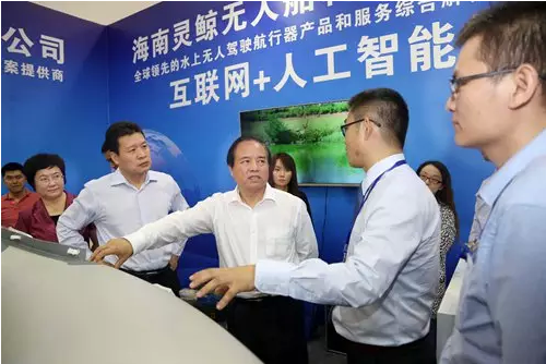 ▲海南省委副書記、省長劉賜貴與海南靈鯨無人船科技有限公司任佳博士交流無人船技術(shù)