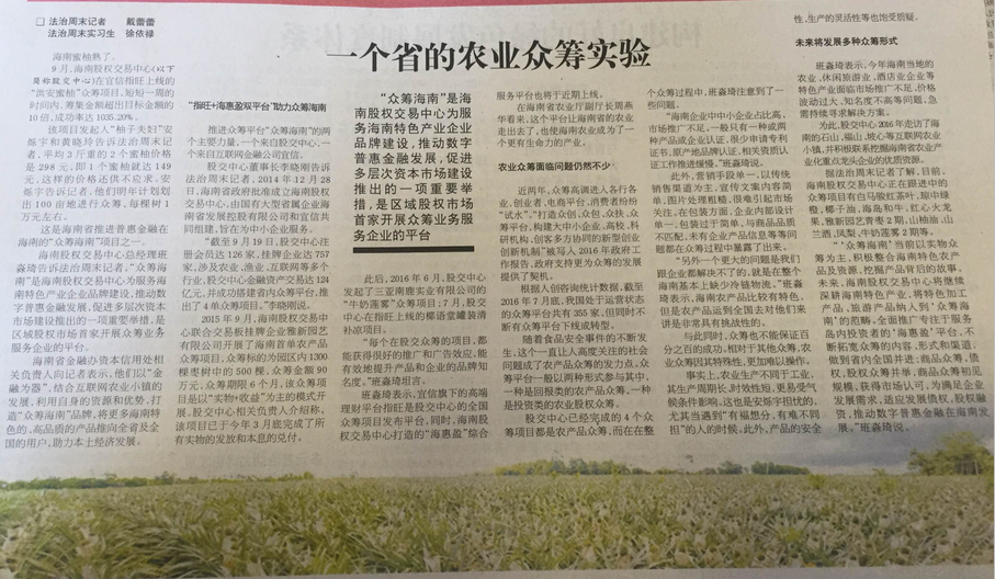 “眾籌海南”作為海南股權交易中心推動海南特色產(chǎn)業(yè)發(fā)展的一項重要舉措,持續(xù)受到媒體關注。最近,面向全國公開發(fā)行的具有鮮明法治特色的中央級主流政經(jīng)周報——《法治周末》以半版篇幅刊發(fā)了《一個省的農業(yè)眾籌實驗》專題文章。