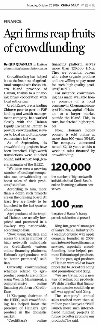 10月17日,國家英文日報《China Daily》刊發(fā)文章《Agri firms reap fruits of crowdfunding》,對海南股權交易中心“眾籌海南”項目進行了深入的報道。