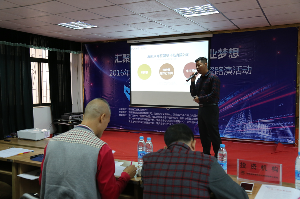 11月24日,“匯聚投資力量,助燃創(chuàng)業(yè)夢(mèng)想——2016年海南省創(chuàng)業(yè)創(chuàng)新項(xiàng)目投資路演”在海南省科技活動(dòng)中心順利舉行,同時(shí)這也是海南股權(quán)交易中心第16期企業(yè)路演?;顒?dòng)由海南省工業(yè)和信息化廳主辦,海南股權(quán)交易中心、海南青創(chuàng)投資管理有限公司、海南省中小企業(yè)服務(wù)中心聯(lián)合承辦,??诮瓥|電子商務(wù)產(chǎn)業(yè)園等多家單位協(xié)辦。9家路演企業(yè)、團(tuán)隊(duì)及6家投資機(jī)構(gòu)參加此次路演活動(dòng)。