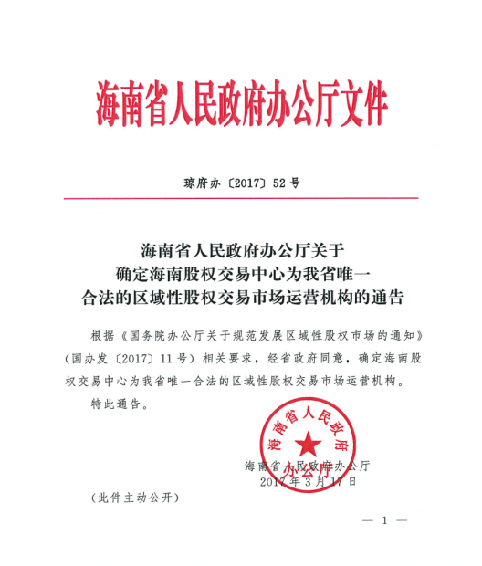 海南省人民政府辦公廳關(guān)于確定海南股權(quán)交易中心為我省唯一合法的區(qū)域性股權(quán)交易市場運(yùn)營機(jī)構(gòu)的通告