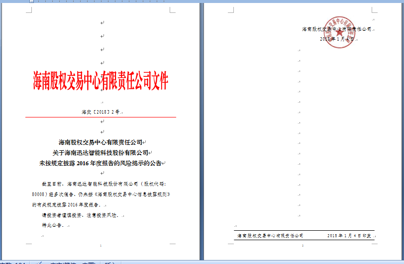 海南股權(quán)交易中心有限責(zé)任公司關(guān)于海南迅達(dá)智能科技股份有限公司未按規(guī)定披露2016年度報(bào)告的風(fēng)險(xiǎn)揭示的公告
