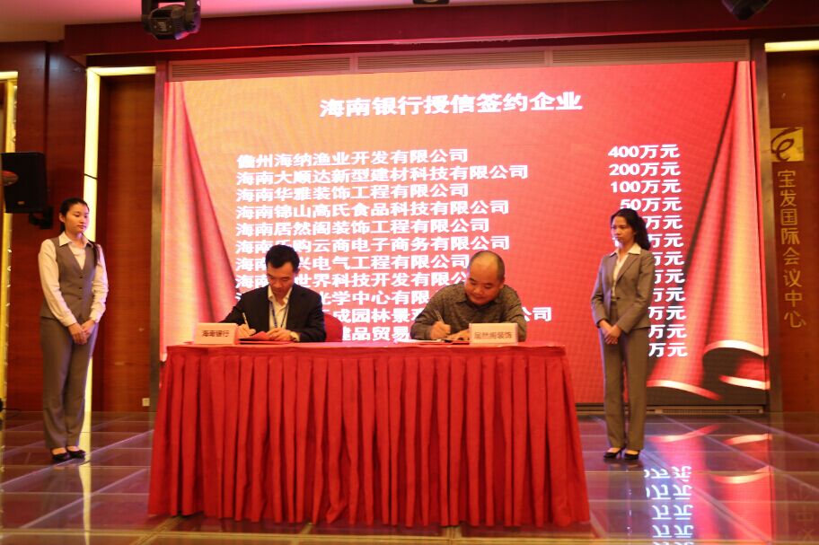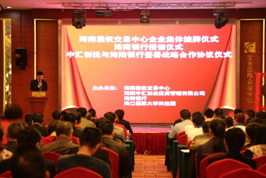 1月15日,海南股權(quán)交易中心企業(yè)集體掛牌暨銀行授信簽約儀式,在??趯毎l(fā)幸福酒店舉行。本次活動(dòng)由海南股權(quán)交易中心、海南中匯創(chuàng)業(yè)投資管理有限公司、海南銀行、??趪?guó)家大學(xué)科技園聯(lián)合主辦。37家企業(yè)現(xiàn)場(chǎng)集體掛牌海南股權(quán)交易中心,其中12家企業(yè)獲得海南銀行合計(jì)額度2100萬元的授信。