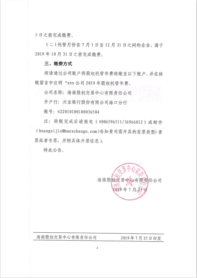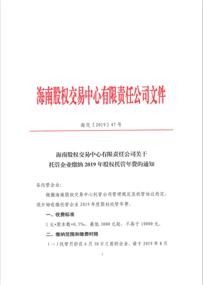 海南股權(quán)交易中心有限責(zé)任公司關(guān)于托管企業(yè)繳納2019年股權(quán)托管年費(fèi)的通知