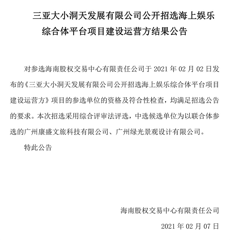 三亞大小洞天發(fā)展有限公司公開招選海上娛樂綜合體平臺項(xiàng)目建設(shè)運(yùn)營方結(jié)果公告