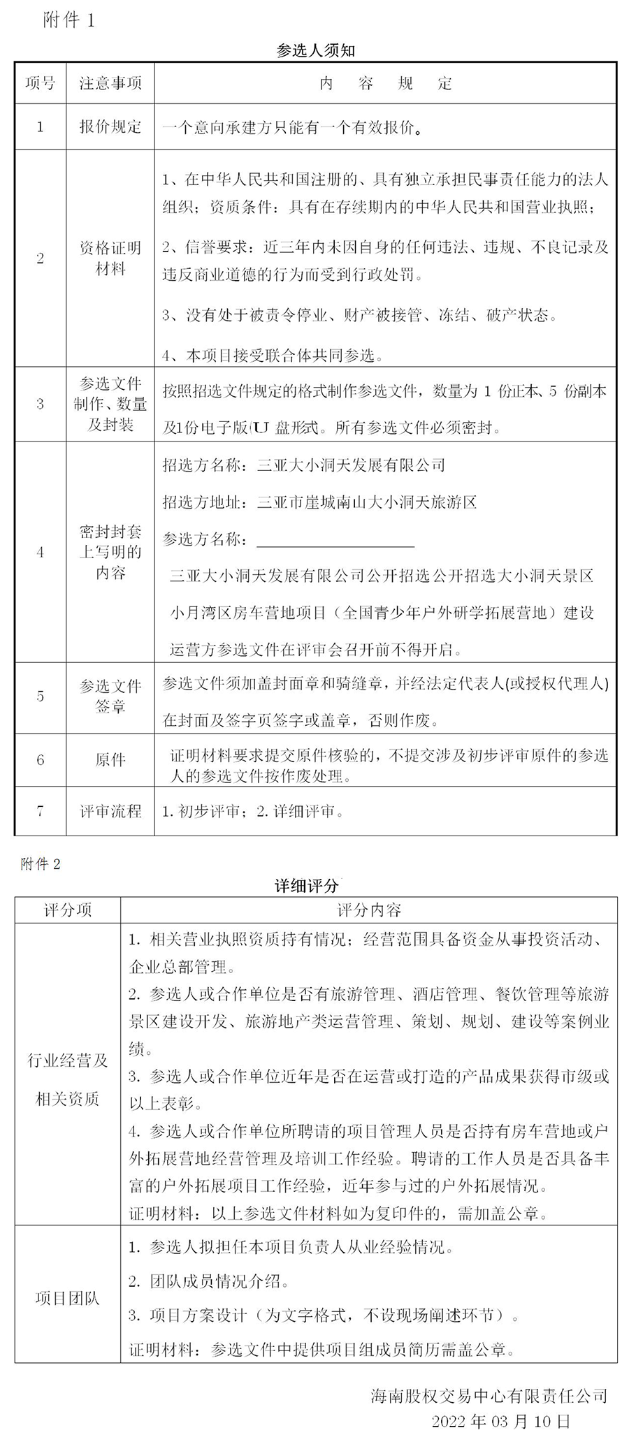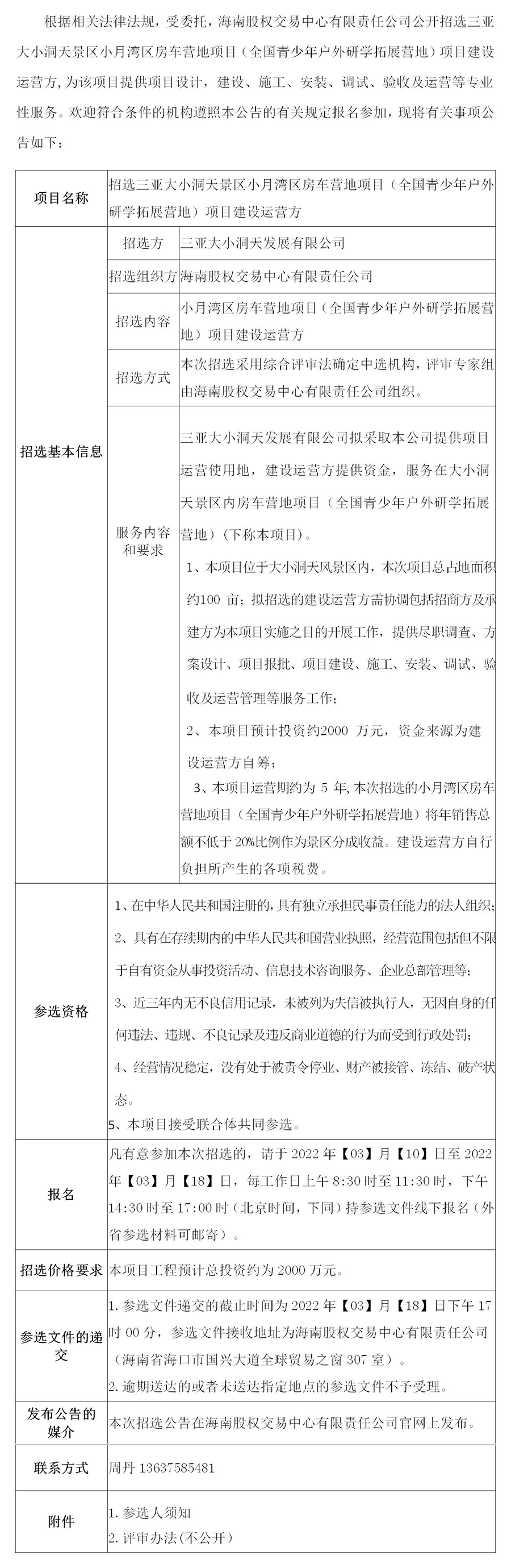 三亞大小洞天發(fā)展有限公司公開招選小月灣區(qū)房車營(yíng)地項(xiàng)目(全國(guó)青少年戶外研學(xué)拓展?fàn)I地)建設(shè)運(yùn)營(yíng)方