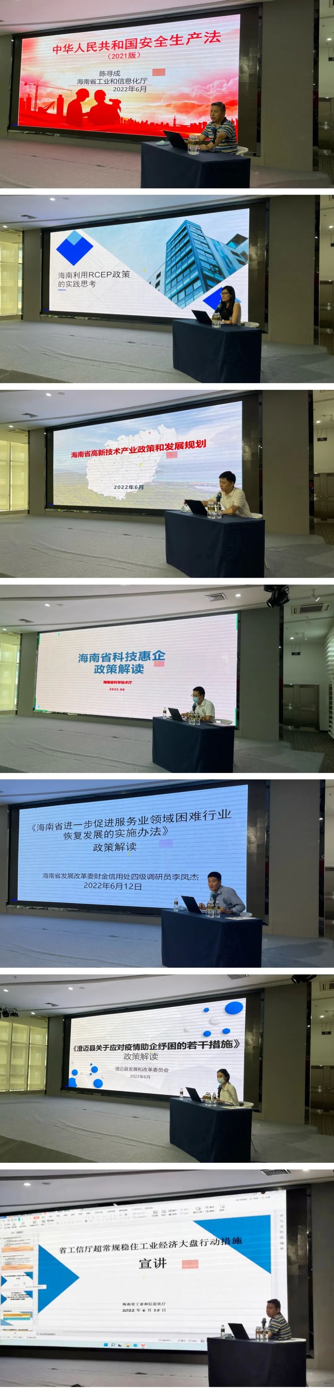 會上,海南省工業(yè)和信息化廳、海南省科學(xué)技術(shù)廳、海南省發(fā)展和改革委員會、澄邁縣發(fā)展和改革委員會等相關(guān)部門針對我省中小企業(yè)紓困扶持政策進(jìn)行宣貫,重點(diǎn)解讀了《保障中小企業(yè)款項支付條例》《安全生產(chǎn)法》《海南工信財政措施實施細(xì)則》《海南省工信廳超常規(guī)穩(wěn)住工業(yè)經(jīng)濟(jì)大盤行動措施》《海南省高新技術(shù)產(chǎn)業(yè)政策和發(fā)展規(guī)劃》《海南利用RCEP政策的實踐思考》《海南省獲批國家級研發(fā)設(shè)計平臺資助實施細(xì)則》《海南省科技型中小企業(yè)認(rèn)定管理暫行辦法》《海南省進(jìn)一步促進(jìn)服務(wù)業(yè)領(lǐng)域困難行業(yè)恢復(fù)發(fā)展實施辦法》《澄邁縣關(guān)于應(yīng)對疫情助企紓困的若干措施》等一系列關(guān)于幫扶中小企業(yè)的政策。