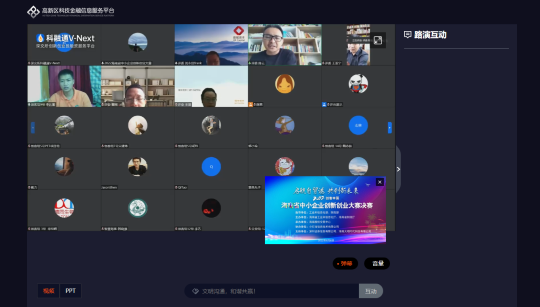 根據(jù)海南疫情防控需要,為降低傳播風(fēng)險(xiǎn),切實(shí)將各項(xiàng)防控措施落實(shí)到位,海南賽區(qū)決賽首次采取“線上路演+遠(yuǎn)程評審”的模式進(jìn)行,路演企業(yè)及評委登錄騰訊會議室,全程線上路演及答辯。值得一提的是,決賽路演同步登錄深交所科融通平臺,直面全國7300多家主流的創(chuàng)投機(jī)構(gòu)和2500多家上市公司。