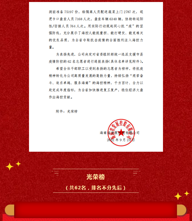 海南控股通報(bào)表?yè)P(yáng)62名疫情防控志愿者
