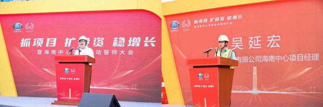 ▲海南中心項目負(fù)責(zé)人王敏(左)、中建三局項目負(fù)責(zé)人吳延宏(右)表態(tài)發(fā)言。