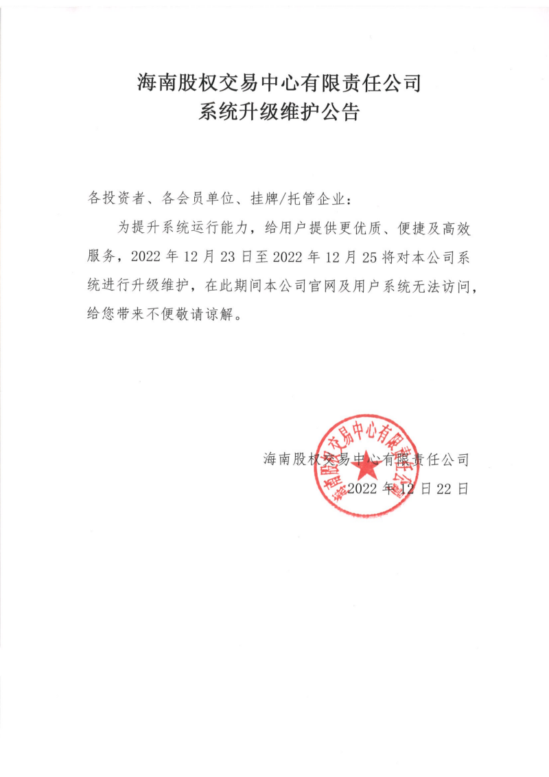 海南股權(quán)交易中心有限責(zé)任公司系統(tǒng)升級維護公告
