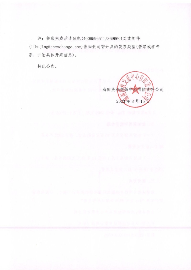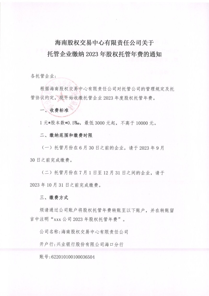 海南股權交易中心有限責任公司關于托管企業(yè)繳納2023年股權托管年費的通知
