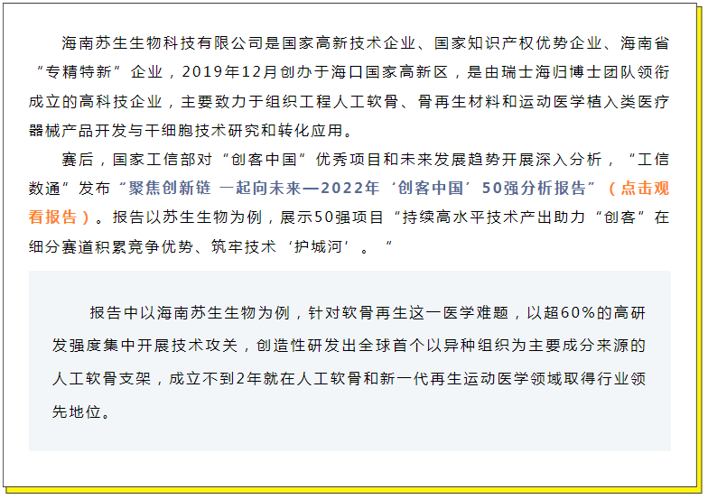 其中來自海南蘇生生物科技有限公司的“人工軟骨和新一代再生運動醫(yī)學”項目入圍總決賽50強,并在最終榮獲總決賽50強第11名,是獲獎企業(yè)組項目中成立時間最短、發(fā)展最快的項目之一。