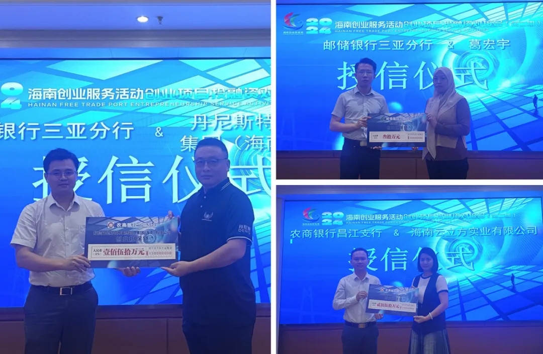 現(xiàn)場舉行了銀行授信儀式,中國郵政儲蓄銀行、海南農(nóng)村商業(yè)銀行分別為個人創(chuàng)業(yè)者及初創(chuàng)企業(yè)進行授信,授信金額共計430萬元,為我省創(chuàng)業(yè)企業(yè)及創(chuàng)業(yè)代表的發(fā)展注入資金支持。