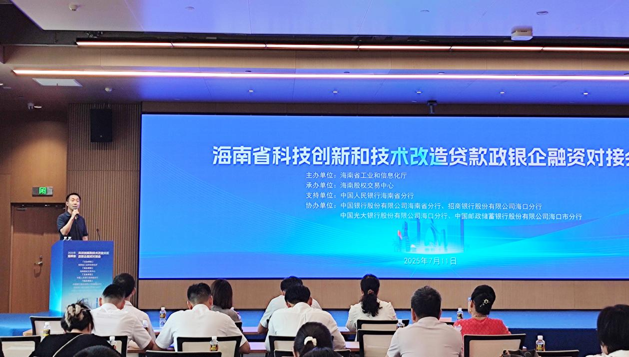 7月11日,海南省科技創(chuàng)新和技術(shù)改造貸款政銀企融資對(duì)接會(huì)在??陧樌e行。此次活動(dòng)由海南省工業(yè)和信息化廳主辦、海南股權(quán)交易中心承辦、中國(guó)人民銀行海南省分行提供支持,旨在深入貫徹落實(shí)創(chuàng)新驅(qū)動(dòng)發(fā)展戰(zhàn)略,推動(dòng)金融資源精準(zhǔn)支持實(shí)體經(jīng)濟(jì),為科技型企業(yè)和技術(shù)改造項(xiàng)目提供更加堅(jiān)實(shí)的融資保障。來(lái)自海南省工信領(lǐng)域的重點(diǎn)企業(yè)代表、專(zhuān)精特新中小企業(yè)、創(chuàng)新型中小企業(yè)負(fù)責(zé)人以及多家金融機(jī)構(gòu)代表共計(jì)七十余人齊聚一堂。各方圍繞科技創(chuàng)新、技術(shù)改造與金融服務(wù)的深度融合展開(kāi)交流,共同探討如何構(gòu)建高效協(xié)同的政銀企合作機(jī)制,打通科技創(chuàng)新與技術(shù)改造融資“最后一公里”。