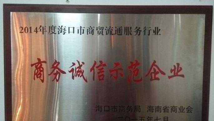 十、2015年7月被??谑猩虅?wù)局、海南省商業(yè)會評為2014年度海口市商貿(mào)流通服務(wù)行業(yè)商務(wù)誠信示范企業(yè)。